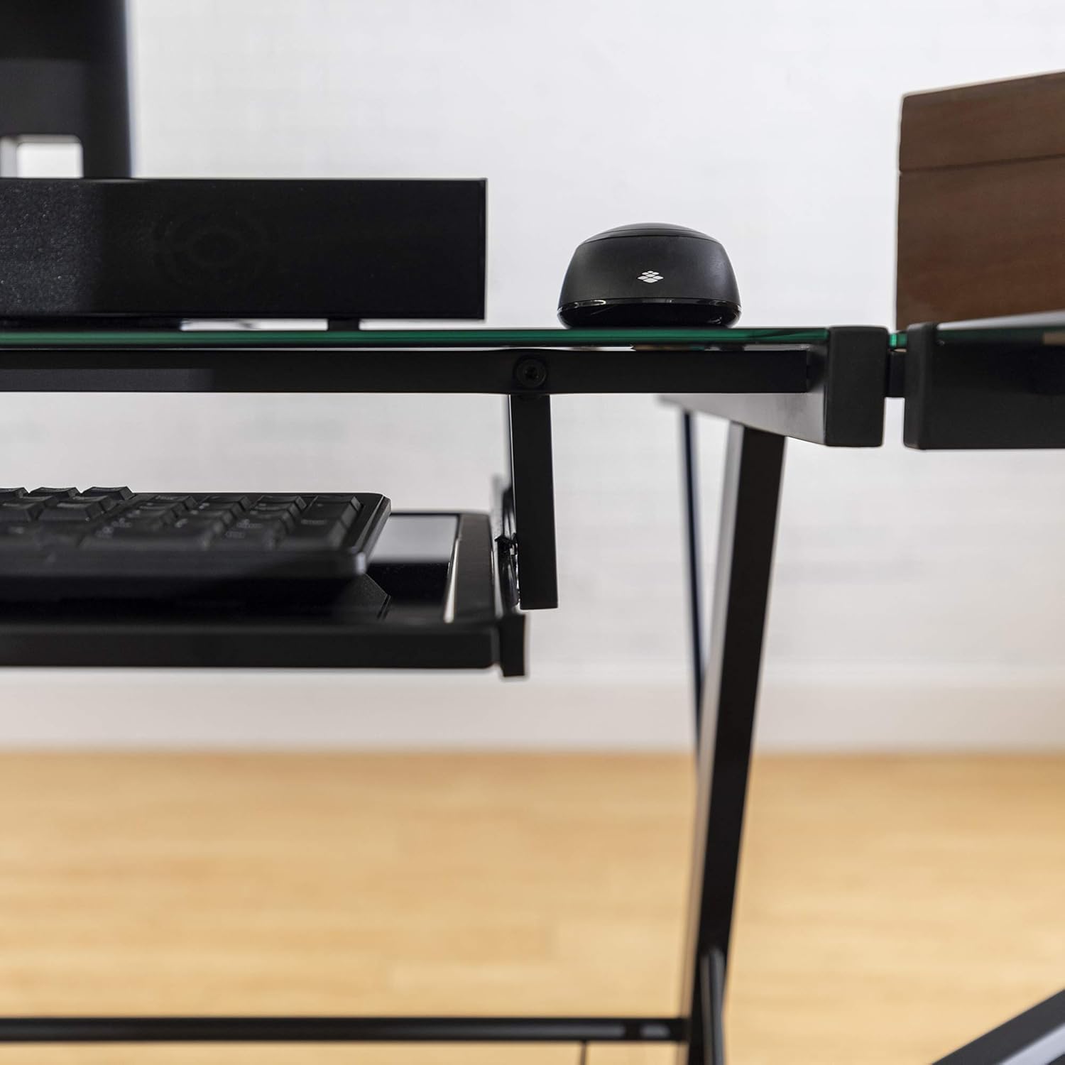 WERE HERE TO HELP. 30042017 The modern sleek and professional looking Walker Edison Soreno 3 piece corner desk Its crafted from beveled tempered safety glass and powder coated steel legs for a durable long lasting desk. - Stylish modern design- Polished and beveled black tempered safety glass- All glass is 6 mm thick- Durable steel frame with black powder-coated finish- S.